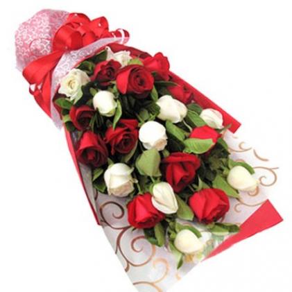 [材 料]:11枝红玫瑰、9枝白玫瑰,绿叶间插 !