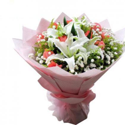 11只粉玫瑰+2熊,米兰满天星装饰,粉色包装纸,粉色蝴蝶结束扎