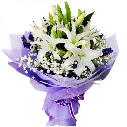 5枝白色多头香水百合,满天星边插,勿忘我搭配!