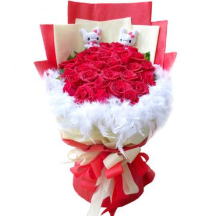 33朵红玫瑰,2只公仔,少量绿叶点缀,白色羽毛围绕,淡黄色、大红色皱纹纸精美单面包装,双色蝴蝶结。