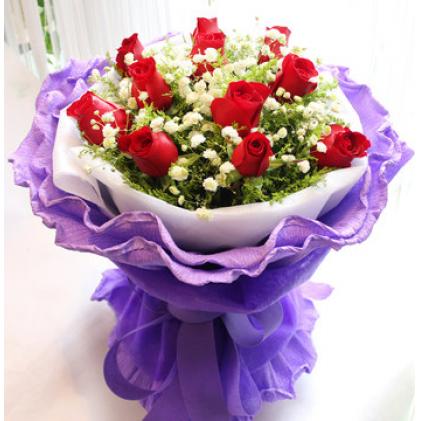 11朵红玫瑰,黄莺+满天星丰满,白色+紫色卷纸,蝴蝶结装饰。