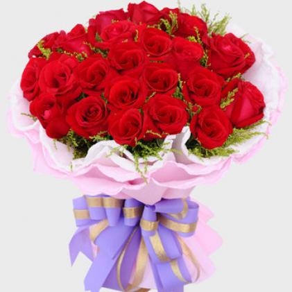 33朵红玫瑰,黄莺间插丰满;包装:白色裙边纸内衬,粉色高档裙边纸外包