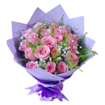 19只粉色玫瑰,黄英满天星间插点缀,浅紫色包装