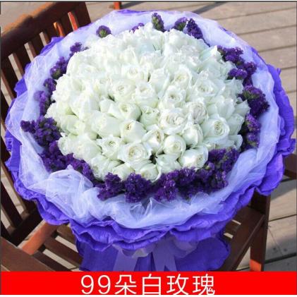 99只白色精品玫瑰,外围绿叶和紫色勿忘我,白色纱网内衬,紫色皱纹纸外包,浅紫色蝴蝶结束腰