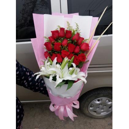 19只红玫瑰,2只多头香水百合,粉色扇面包装