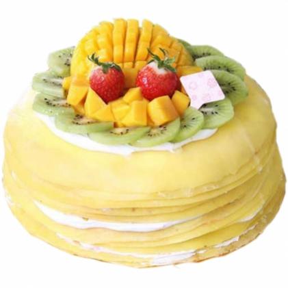 圆形芒果千层蛋糕,芒果果肉、超薄鸡蛋皮、新鲜奶油层层叠加,香滑柔嫩,细腻鲜香。