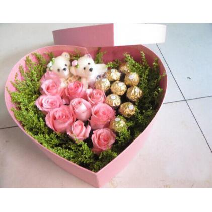 9只红玫瑰+2熊+9个费罗列巧克力 心形礼盒