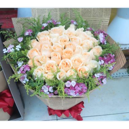 33只香槟玫瑰+2只熊 英文报纸包装