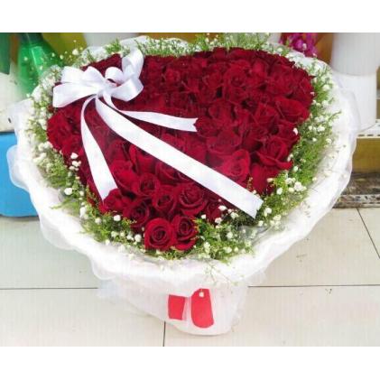 99只红玫瑰,心形白色软纱包装,满天星米兰外围,