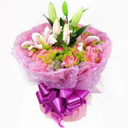 [说 明]:永远健康 [材 料]:19朵粉色康乃馨+2支多头百合,点缀绿叶。 [包 装]:粉色雪纱内衬,外用瓦楞纸圆形包装!