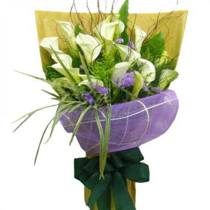 [名 称]:浓浓真情 [材 料]:26枝马蹄莲,黄莺勿忘我搭配,配材点缀。 [包 装]:高档扇形精美包装。 [花 语]:只是一个小小的问候,却是一片浓浓的真意, 愿你所有的日子洋溢着欢欣喜悦,一生幸福安康!