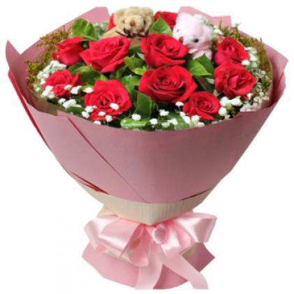 11只红玫瑰+2公仔 绿叶满天星 点缀