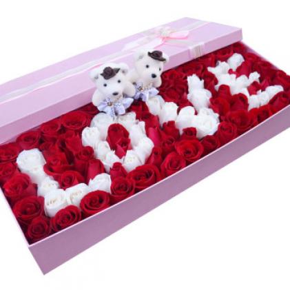 99只红白玫瑰+2公仔,粉色礼盒